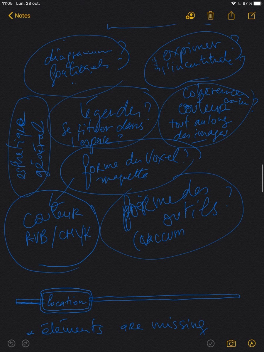 All day long, designers, engineers and researchers will discuss in small groups and will create sketches (slides, exemples, references, models, printings, …) to envision the various aspects and visual design issues of the global project.