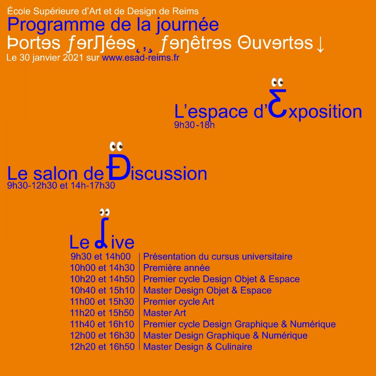 Un salon virtuel de présentation des options enseignées à l’école : Art, Design Objet & Espace, Design Graphique & Numérique et Design & Culinaire. Ces moments forts seront animés par les enseignant.e.s et les étudiant.e.s, qui pourront répondre à vos questions. Des séances d’information sur les procédures d’inscription (concours d’entrée et commissions d’équivalence) vous seront aussi proposées. Le programme de ce salon en ligne sera publié dix jours avant l’événement.