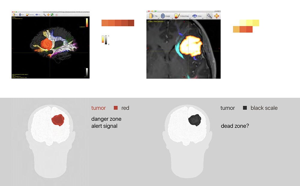 Les pratiques neurochirurgicales sont progressivement guidées par les technologies de tomographie avec de plus en plus de détails anatomiques, comme l’imagerie par résonance magnétique (IRM). Ces technologies d’imagerie tomographique permettent l’analyse et la planification préchirurgicales, ainsi que la navigation chirurgicale. Cependant, un nombre croissant de paramètres et de données sont à la disposition du chirurgien afin de planifier sa chirurgie, d’élargir le processus et d’exiger une perception complexe. La perception du chirurgien repose en grande partie sur les processus d’imagerie, qui doivent être soutenus par le développement de nouvelles interfaces conçues pour faciliter la navigation dans les données et la consolidation de nombreuses entrées, par exemple des antécédents médicaux des patients aux architectures structurelles du cerveau. Pour faire progresser ces représentations numériques, nous développons des modèles fonctionnels et des prototypes qui introduisent de nouveaux paradigmes à la fois dans la visualisation et l’analyse d’images dans un cadre interdisciplinaire, composé de conception graphique, de conception de logiciels, d’anthropologie cognitive, de génie logiciel et de neurochirurgie. Ces explorations interdisciplinaires mènent à de nouvelles perspectives sur la tâche neurochirurgicale et à de nouveaux types de connaissances qui sont transférées par ces outils.