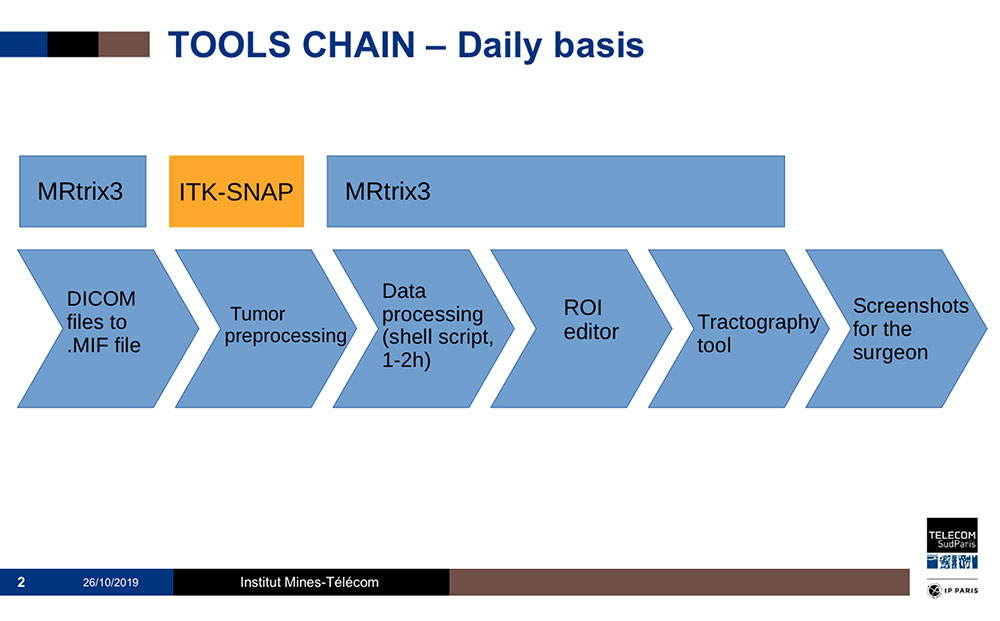 Ensemble, l’équipe de recherche internationale nouvellement constituée développera et comparera plusieurs logiciels alternatifs d’analyse d’images et concevra de nouvelles interfaces logicielles pour l’analyse et la manipulation d’images neurochirurgicales avancées, sous la forme de prototypes expérimentaux réalisés par des étudiants français en maîtrise en conception et ingénierie. De plus, les technologies d’affichage et de visualisation seront étudiées dans le but de fusionner spatialement les formes virtuelles et physiques de l’action humaine dans la planification neurochirurgicale. Ainsi, ces modèles intégreront des données avancées de suivi des fibres (délimitation probabiliste de la substance blanche humaine, basée sur l’IRM de diffusion) ainsi que des données connectomes (réseau cérébral structural-fonctionnel). De nouveaux modes d’interaction, basés sur une analyse interdisciplinaire des concepts historiques et contemporains de visualisation de données d’imagerie et de divers gestes techniques, conduiront à un changement de paradigme dans l’analyse d’images préchirurgicales et donc à une meilleure planification préchirurgicale. De plus, l’exploration des techniques de cartographie individuelle des neurochirurgiens, leur utilisation de modèles mentaux et de repères visuels, nous permettra de mieux comprendre l’observation des images et la façon dont les connaissances complexes sont transférées.
