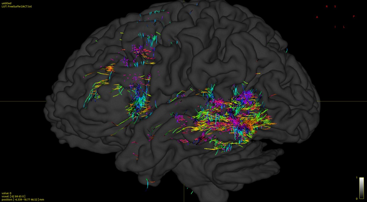 Rendu d’un connectome de groupe basé sur 20 sujets. Les fibres anatomiques qui constituent l’architecture de la matière blanche du cerveau humain sont visualisées sous forme de codes de couleurs par la direction de traversée (xyz-directions qui correspondent respectivement aux couleurs rgb). La visualisation des fibres a été réalisée à l’aide du logiciel TrackVis. source