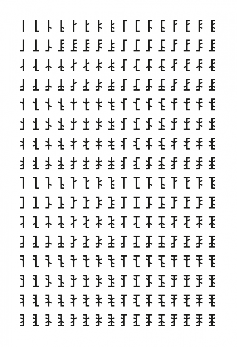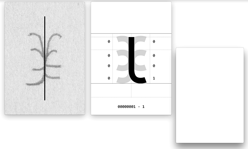 L’objet final prend la forme d’un système de signes et d’une proposition d’encodage d’images sur papier. Le système reprenant les 256 variations possibles de l’octet — de 0000 0000 à 1111 1111 — Ce signe peut être lu mais également écrit, redonnant un contrôle de l’homme sur la machine et donnant une forme à un langage qui n’a jamais eu que des formes « pratiques ».