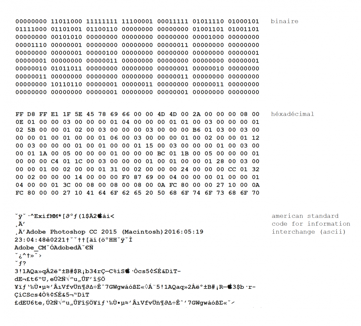 Or toutes ces technologies reposent sur un langage numérique, un code, le binaire. La force de ce langage est d’être indéformable. Ce qu’un capteur numérique a saisi et traduit en impulsions électriques puis en 0 et 1 par la numérisation, aura toujours la même signification, il n’y a pas d’ambiguïté possible. C’est de l’information « pure ». Il y a un donc un paradoxe entre la force que représente le langage numérique et son incarnation physique sur des supports fragiles et volatiles.