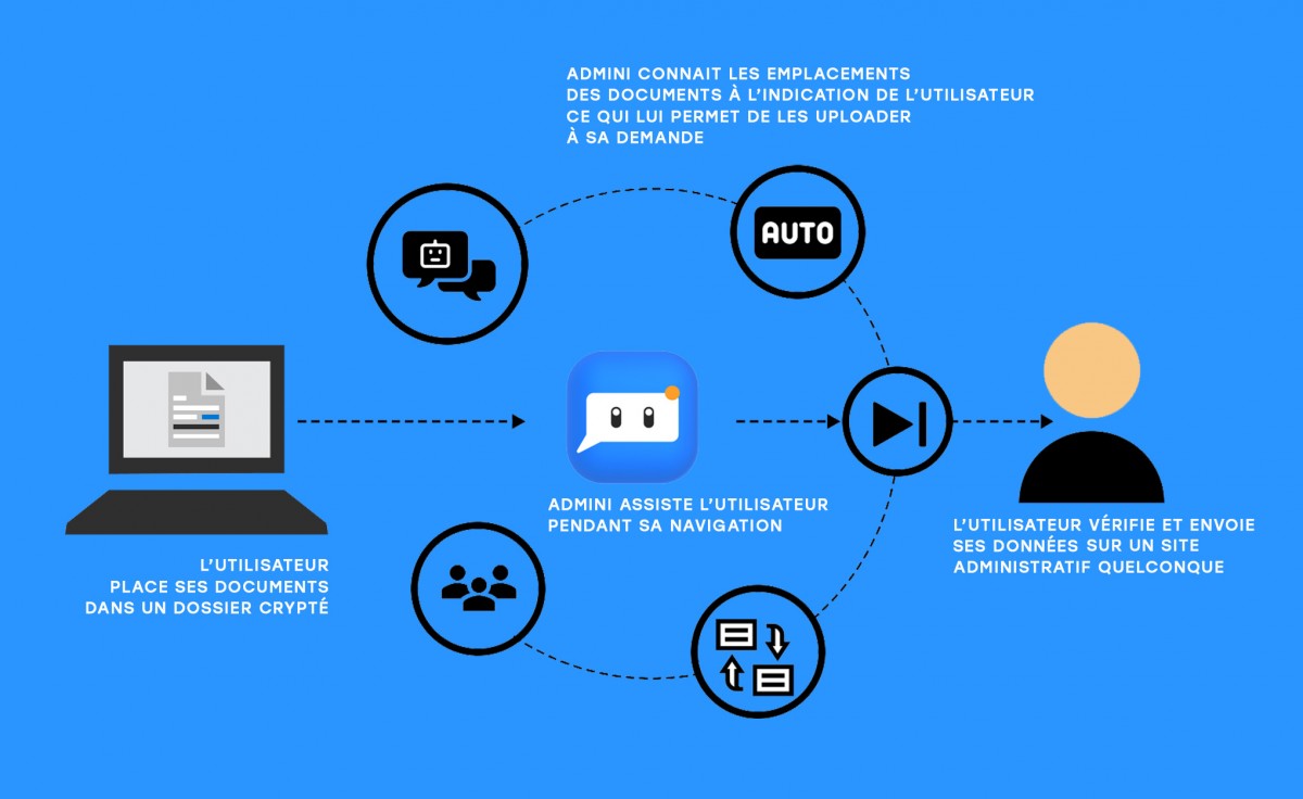 Face à la complexité des démarches administratives, le gouvernement tente de proposer des solutions digitales en ligne pour faciliter le processus et permettre une meilleure accessibilité des aides et des solutions pour la population. Cependant, les sites chargés des démarches administratives présentent des inconvénients ainsi que des obstacles pour l’utilisateur, notamment la barrière de la langue, la complexité des termes utilisés, l’interface utilisateur pas toujours mise en avant, des étapes fastidieuses ou encore le manque de réponse de la part des instances administratives. C’est ainsi que nous avons imaginé Admini, le chatbot interactif qui facilitera vos démarches administratives.