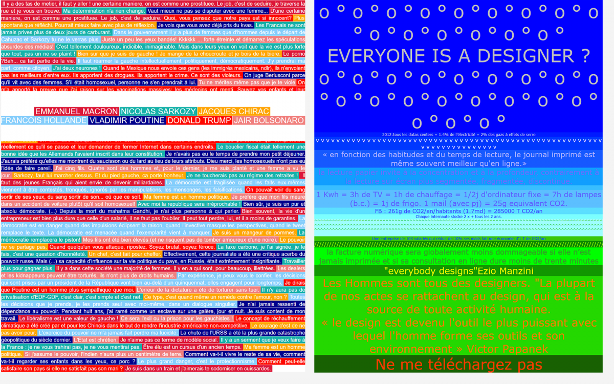 Ci-dessus, à gauche, webdesign de Jeanne Bortolussi, d’après des citations d’hommes politiques célebres. À droite, webdesign d’Adrien Dufournet d’après le texte When everybody designs, d’Ezio Manzini.