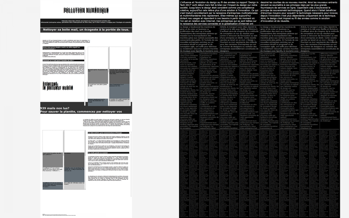 Ci-dessus, à gauche, webdesign de Julie Garcia, sur des données à propos de la pollution numérique et un système de correspondances entre colonnes. À droite, webdesign de Clémentine Bouix sur un texte de John Maeda.