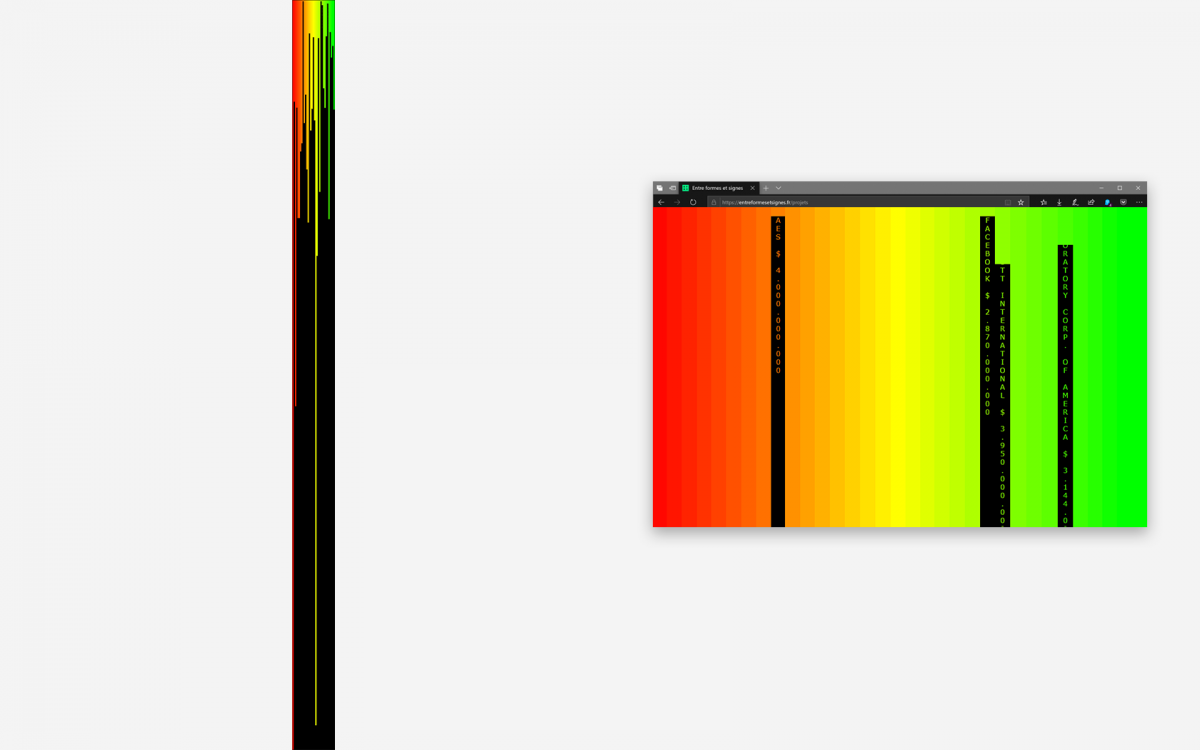 Ci-dessus, webdesign de Julien Vallée, sur des données extraites des Panama Papers. ici, le défilement dans la fenêtre associe une notion de temporalité : plus une valeur de données est grande, plus elle perdure.