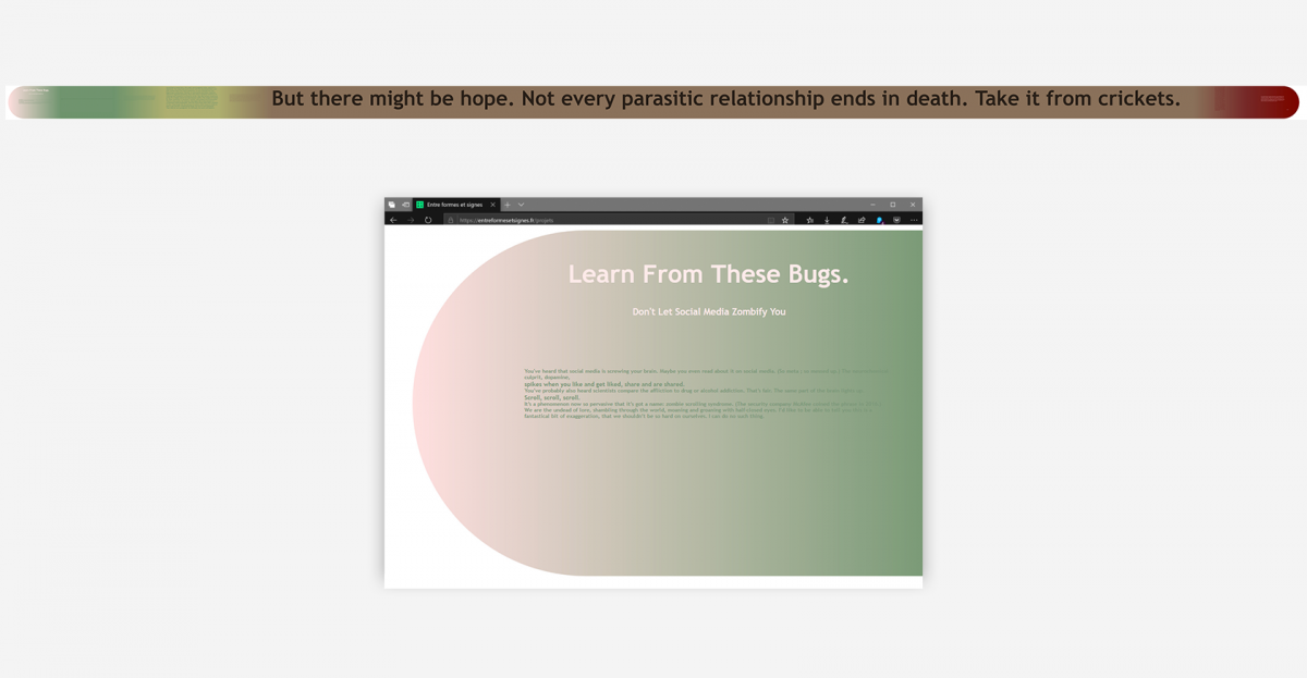 Ci-dessus, webdesign de Marion Zirn, d’après le texte Learn from these bugs, don’t let social media zombify you, de Matt Simon. Ici, la navigation s’opère par défilement horizontal, amenant à des sections de textes, en colonnes ou plein écran.