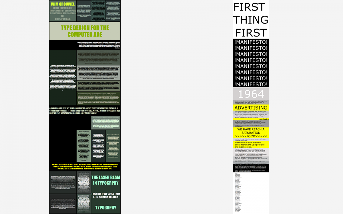 C’est ainsi l’occasion d’explorer à la fois le matériau texte et les ouvrages de Mieke Gerritzen et Geert Lovink, qui traitent de la standardisation des outils et des pratiques du design, en l’occurrence par un design manifeste. De la même façon, les étudiants choisissent leur propre texte, dont ils exploitent la dimension critique dans cette même optique manifeste. Utilisant des aspects bruts du webdesign, des polices uniquement webcore fonts, des palettes de couleurs contrastées, et en conceptualisant les propriétés de la navigation dans ce contenu…