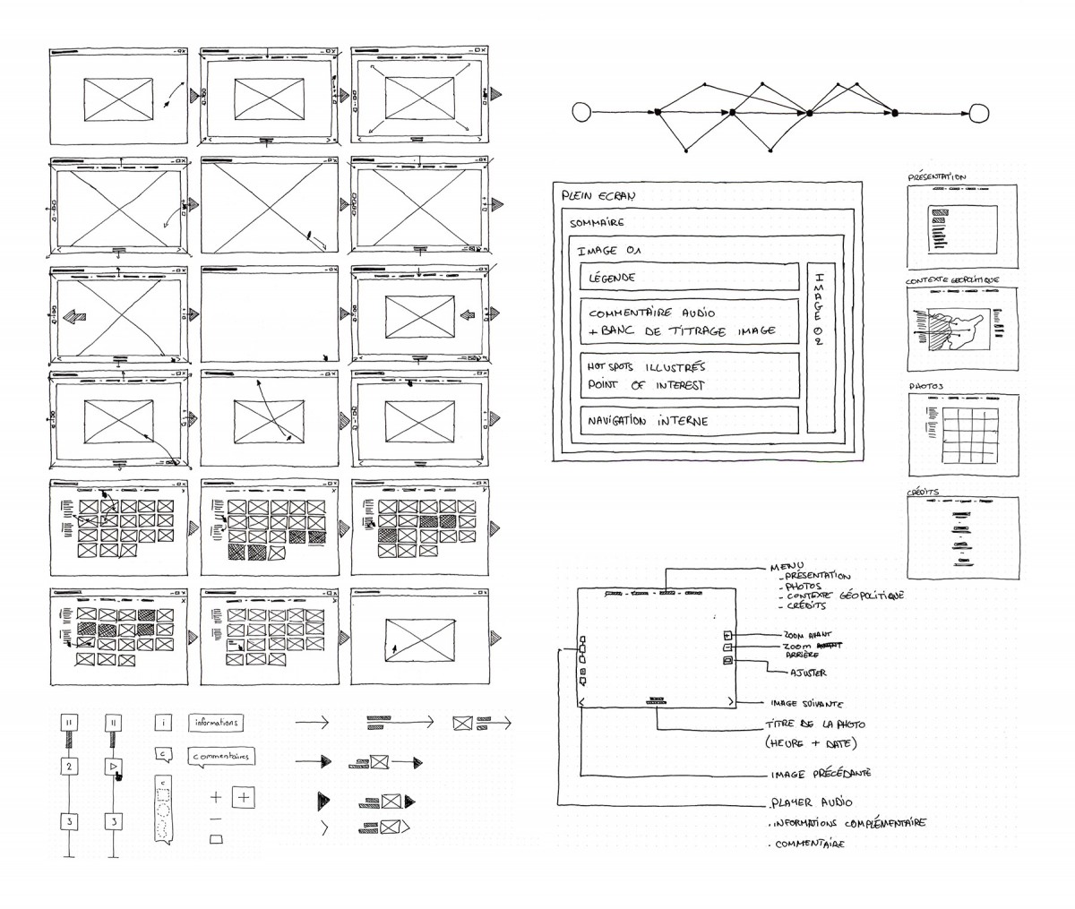 L’idée principale a été de repenser la manière dont on raconte une histoire constituée de photographies à l’aide d’une technologie de cartographie interactive « leaflet.js », qui spatialise l’affichage de la séquence d’images, et propose au visiteur de constituer son propre parcours dans l’ensemble photographique en lui permettant de jouer avec son propre « hors-champ ».