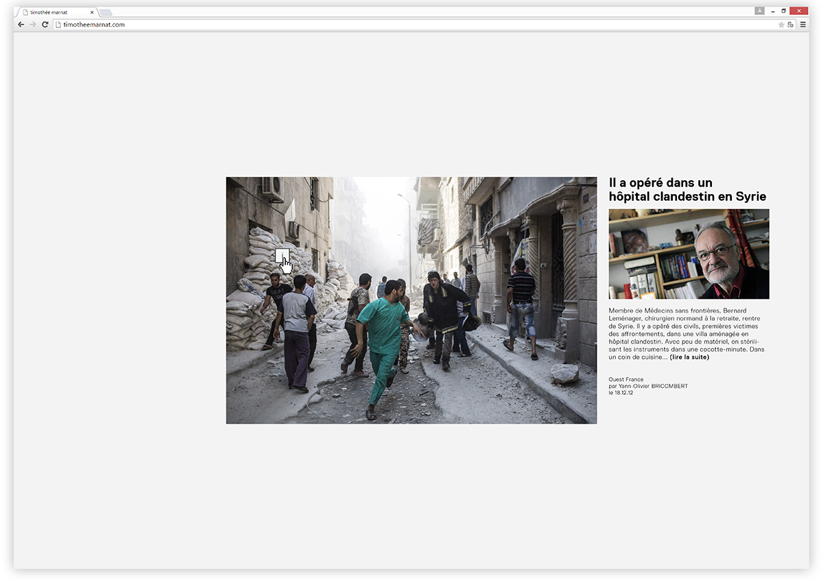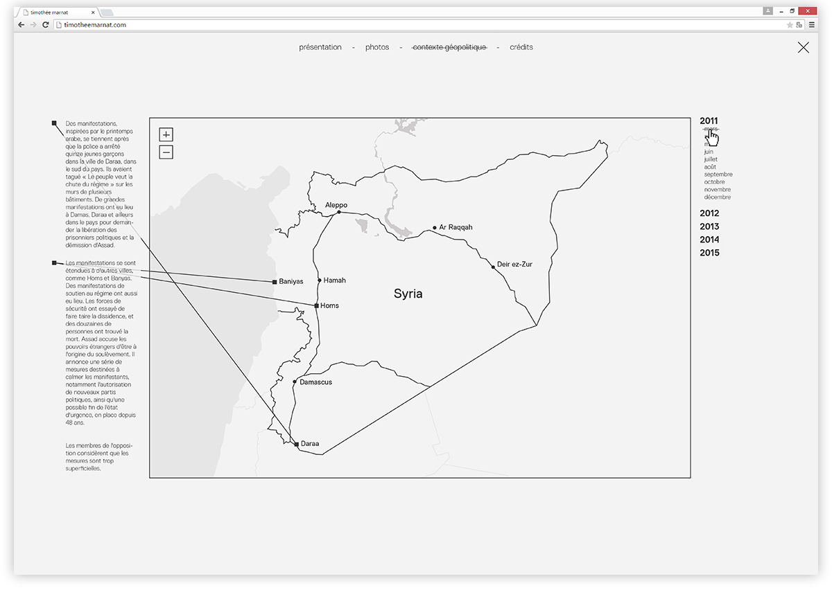 La navigation est inspirée des systèmes de jeu de point and click. En survolant les photos avec la souris, des éléments viennent se révéler et permettent l’accès à des contenus complémentaires (reportages vidéo, articles de presse, émissions de radio, etc), Timothée Marnat