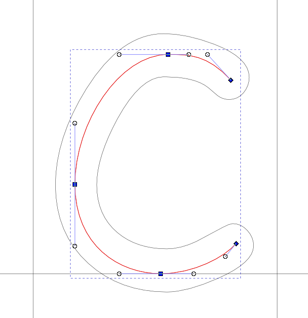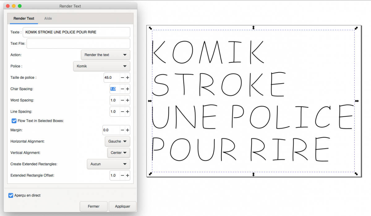 Dans l’optique d’utiliser des outils de traçage (plotter, fraiseuse à commande numérique, etc.) nous désirions que les glyphes1 soient définis par une ligne qui s’apparenterait à un ductus2 calligraphique. Malheureusement le format des polices de caractère numérique actuel ne supporte pas les tracés ouverts, nous avons dû nous retourner vers le format svg qui permet la description de polices avec des tracés non fermés. La police ainsi créée est utilisée avec logiciel libre de dessin vectoriel Inkscape.