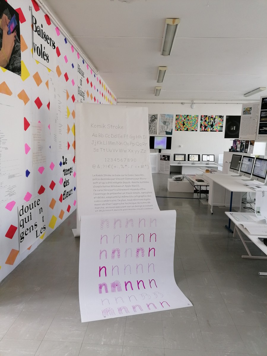 Le Komik Stroke se base sur le Comic Sans MS, police dessinée par Vincent Connare pour Microsoft et qui a été intégrée depuis, dans le système d’exploitation Windows et Apple MacOS. Ce caractère particulièrement répandu offre l’avantage de présenter un tracé simple, sans pleins et déliés, emprunté lui-même à la calligraphie des comics américains. De plus, nous désirions également vérifier l’approche technique de notre démarche, en nous appuyant sur un design existant et déjà inscrit dans le patrimoine visuel commun.