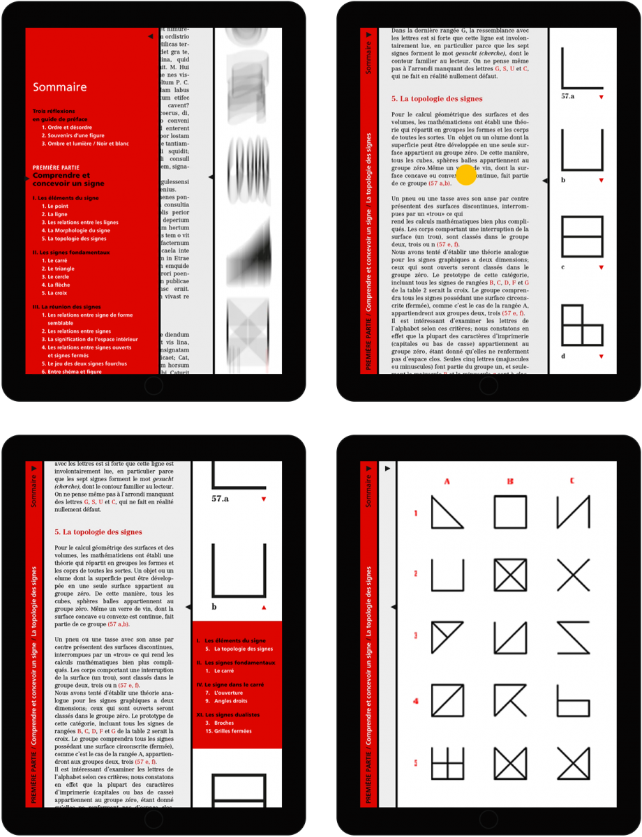 Le projet propose un principe d’adaptation numérique de l’ouvrage d’Adrian Frutiger intitulé « L’Homme et ses signes », paru en 1983. L’interface laisse de côté le principe de segmentation du contenu en pages au profit du principe plus ancien de volumen. Elle fonctionne essentiellement sur le procédé du scrolling différentiel entre trois niveaux simultanés de contenu : le sommaire, le texte, les figures illustratives. Le lecteur peut circuler dans l’ouvrage en utilisant le niveau de contenu qu’il préfère, et changer son mode de navigation à chaque instant. Les figures illustratives génèrent des micro-sommaires spécifiques qui permettent un quatrième niveau de circulation transversale.