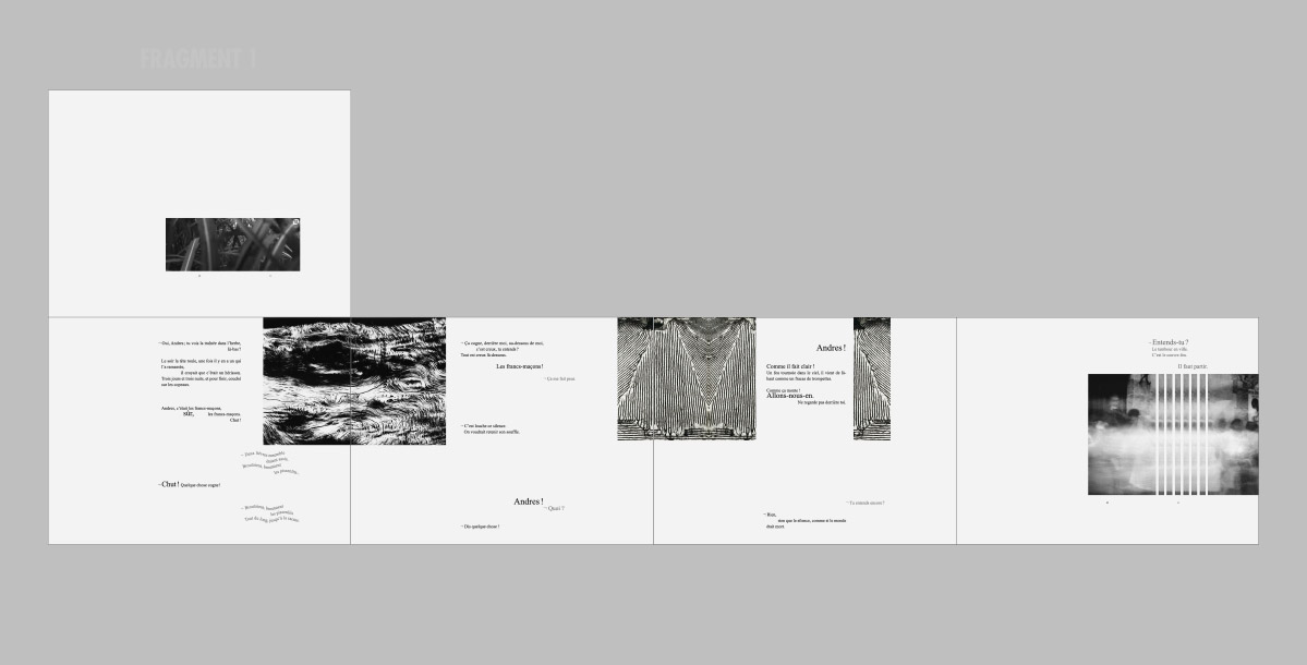 Les différents visuels accompagnant ce projet présentent un exemple de lecture possible du texte. Celle-ci est composée de seize fragments dont l’ordre est défini par les choix du lecteur. Ce dernier expérimente donc une lecture atypique, au sein de laquelle les échappées imaginaires se multiplient.