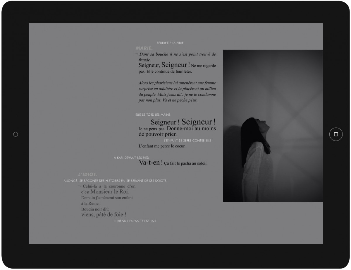 Lire le théâtre n’est pas chose aisée. Les règles actuelles de mise en page de ce type de texte sont très limitées et davantage destinées aux professionnels du théâtre (acteurs, metteurs en scène) qu’aux simples lecteurs. Ces textes sont destinés à être transportés, interprétés. Ce projet de livre numérique propose une forme de mise en scène, non pas destinée aux spectateurs, mais bien aux lecteurs.