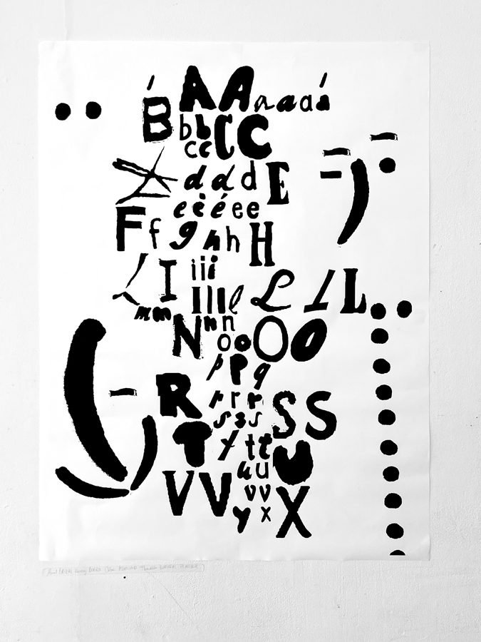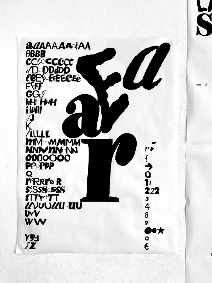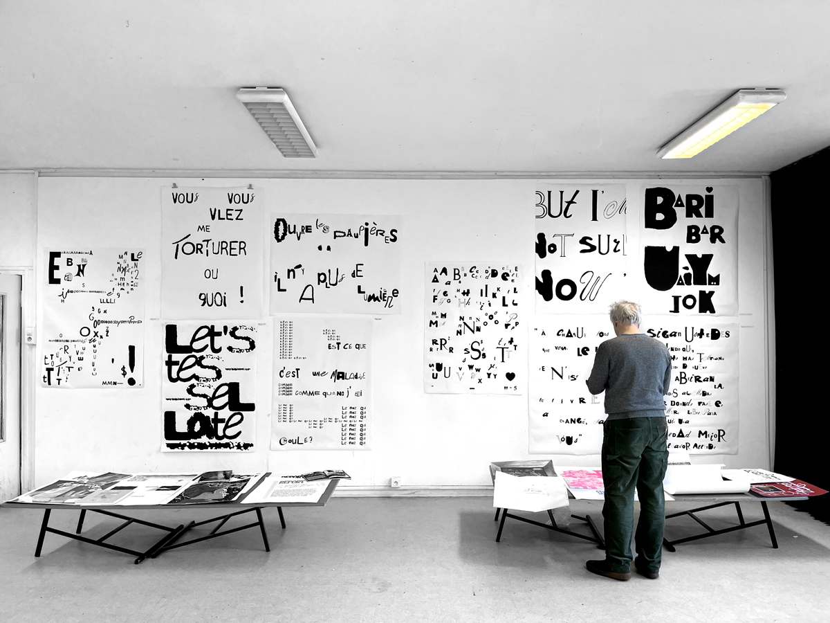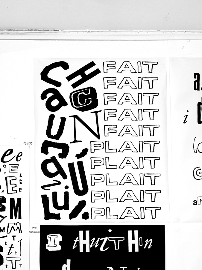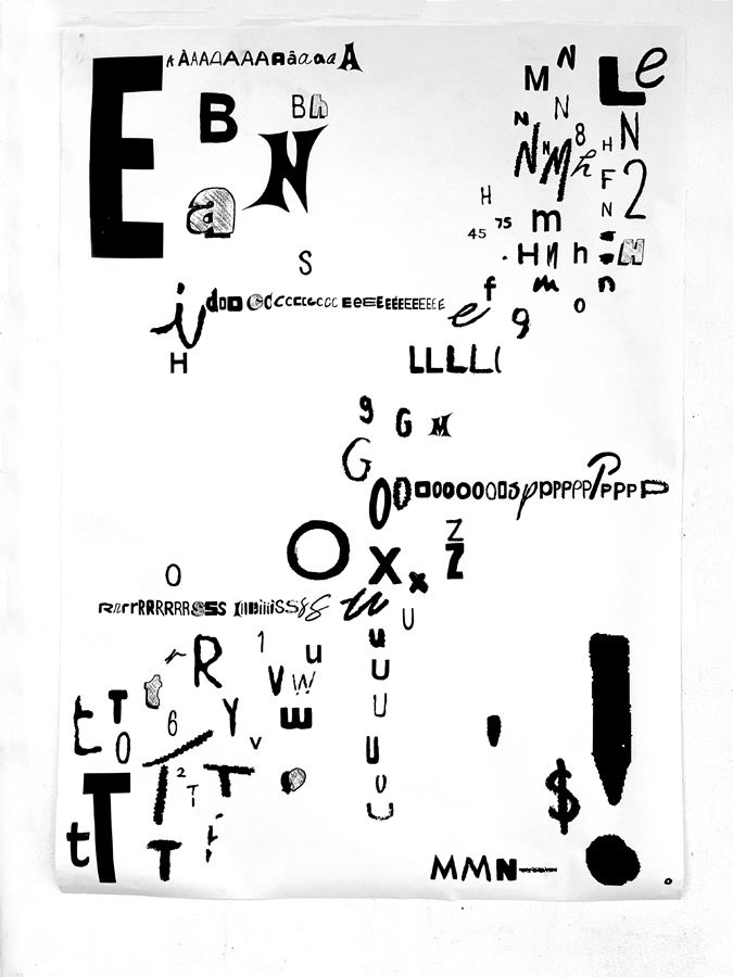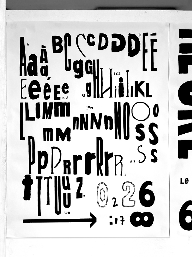 D’une sélection d’objets imprimés de seconde main (du magazine à la pochette vinyle) à l’élaboration d’abécédaires «mélangés» jusqu’à la réécriture de textes, les étudiant·es ont expérimenté par le dessin et la reproduction mécanique l’élaboration de caractères typographiques. Ainsi les caractères composés sur une surface donnée deviennent des textes à lire et à voir.