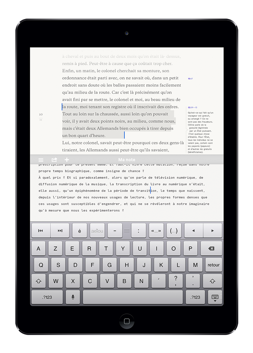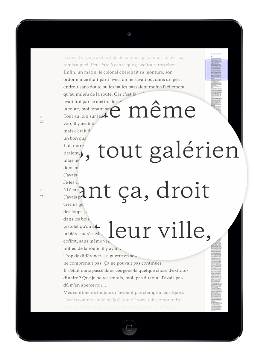 Pour comprendre ce que l’iPad peut apporter à l’expérience de lecture, il a fallu se confronter aux outils de production de livre numérique. Ainsi, par des phases de test, j’ai pu expérimenter différentes interactions entre le lecteur et l’iPad, ses gestes et le texte, pour sélectionner les plus intuitives. L’objectif étant d’immerger le lecteur dans l’acte de lecture.