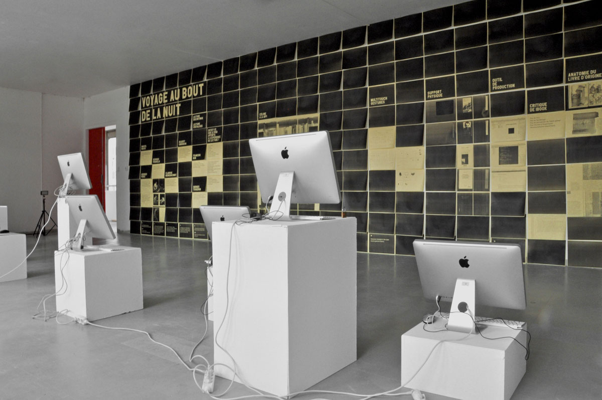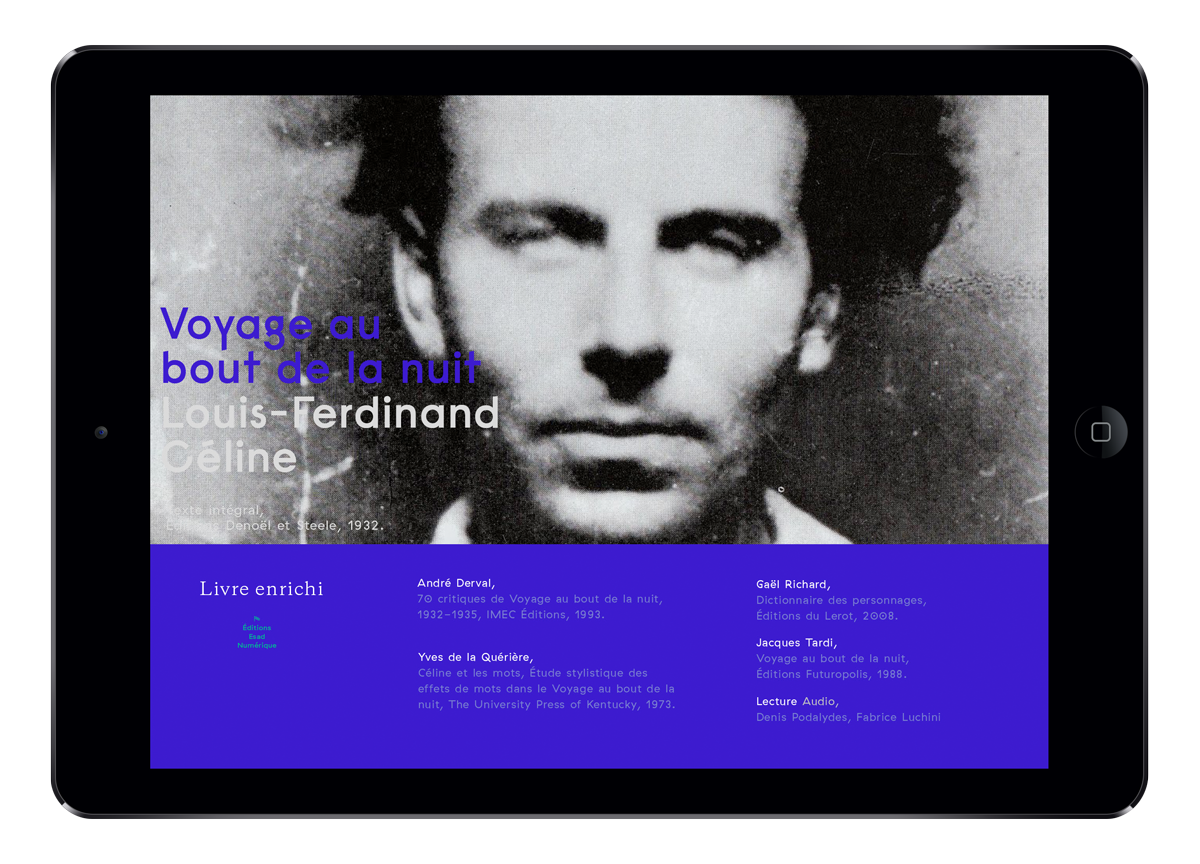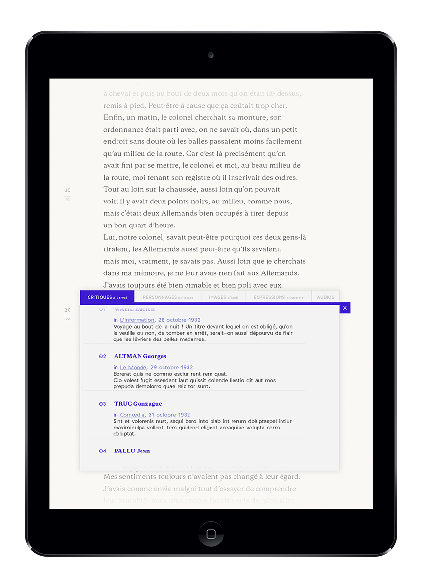 Je suis parti de Voyage au bout de la nuit, un monument littéraire, qui a été beaucoup interprété, illustré, commenté. Plusieurs données autours de l’œuvre, sont « recontextualisés » dans une interface dépouillée de bouton ou de clic. Cela permet par exemple, de faire des allers-retours entre le texte de Céline et l’analyse des personnages pendant la lecture, sans perdre le texte de vue. L’espace de l’œuvre et l’espace des personnages existent simultanément, et à plusieurs échelles. — Thomas Guigue