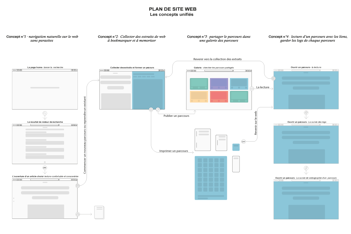 Ceci nous amène donc à la notion de partage qui existera sur le site. Que ce soit par voie imprimée ou l’impression se fera directement par le site ou par le document PDF téléchargeable, ou encore par voies virtuelles via des partages classiques de lien. Les formats d’impression dépendront de ce que l’utilisateur souhaite imprimer (petit livre au format A5, flyers, etc…). J’ai également imaginé le système d’une galerie de parcours dans laquelle l’utilisateur pourra soit naviguer, soit effectuer une recherche et bien sûr partager les parcours qu’il a réalisés (fig.5).