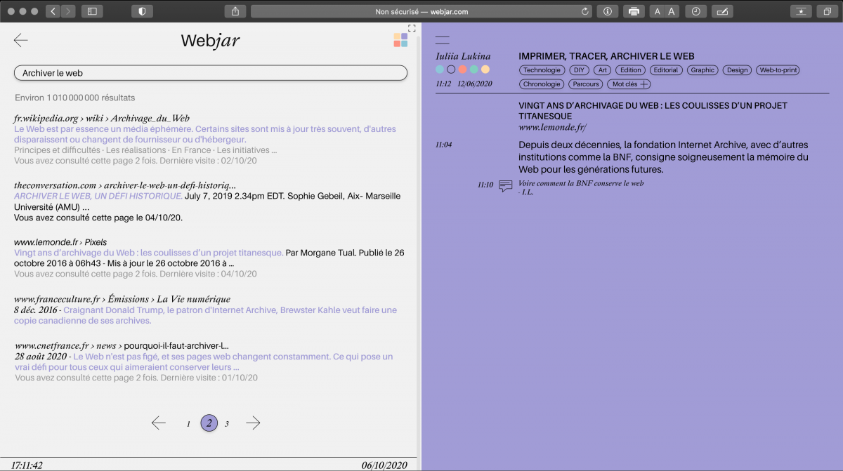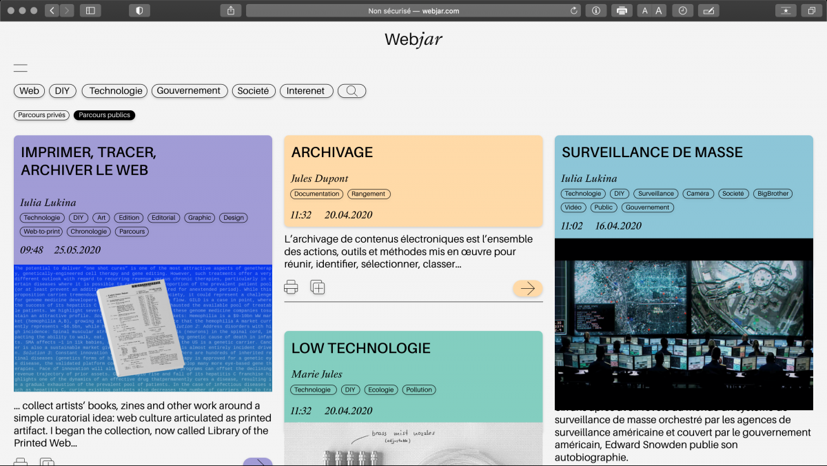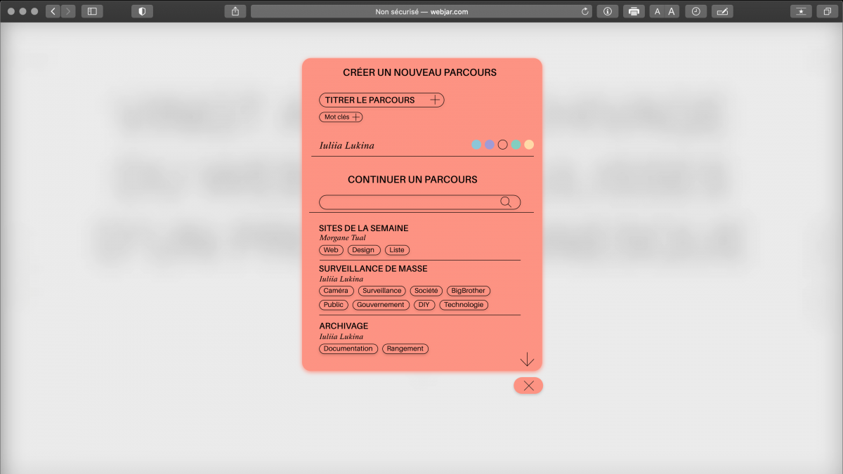 Par la suite si l’utilisateur souhaite conserver des extraits qu’il a trouvé interessants lors de sa navigation il peut créer un parcours ou en reprendre un déjà existant. Ici, le mot parcours se traite comme notre trace sur internet - tout ce qui a attiré notre regard et qu’on a décidé de sauvegarder. Il y aura la possibilité de titrer ses parcours, de les personnaliser, d’ajouter des mots clés qui permettront de mettre en place un système de classement sur le site. Ces classifications permettront à l’utilisateur, à la manière des hashtags utilisés un peu partout, de retrouver facilement des parcours sur les thèmes qui l’intéressent (Fig.3). De plus, il est possible d’ajouter des commentaires pour chaque extrait.