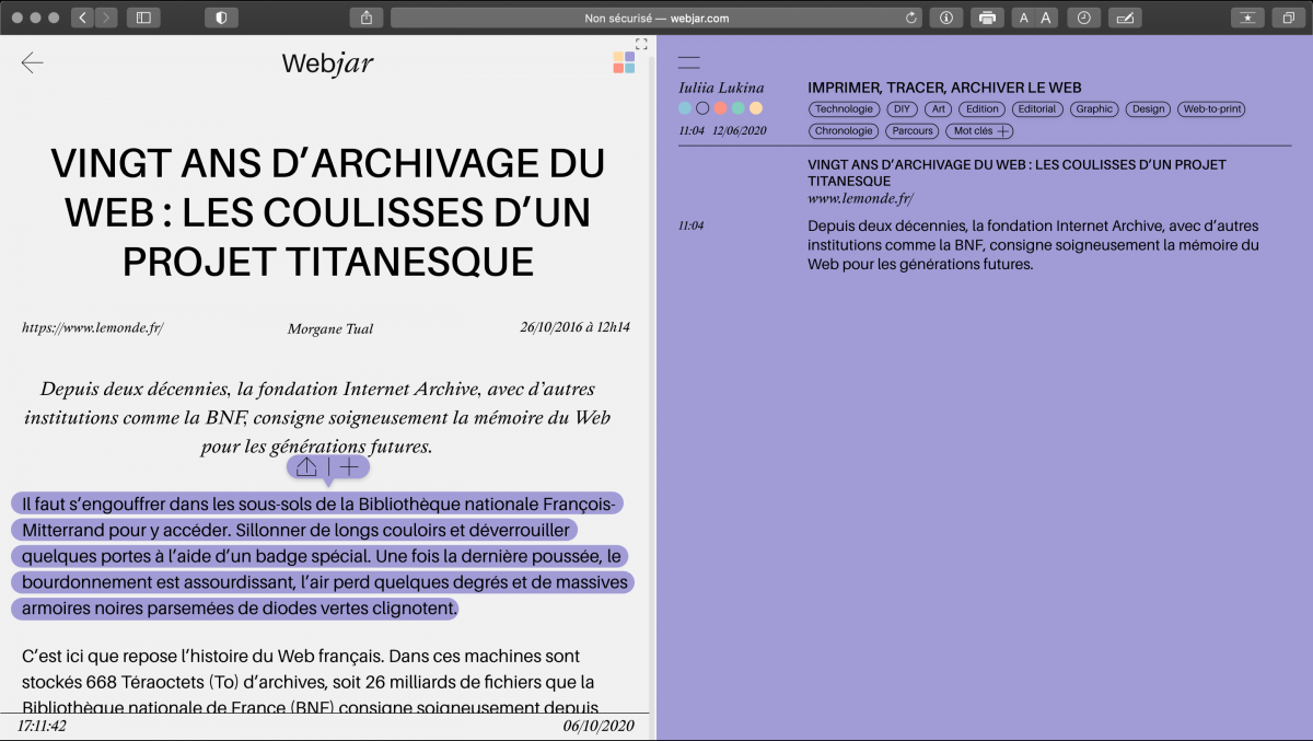 - L’utilisateur peut ajouter des extraits ( texte, image ) grâce à la sélection d’une partie d’un