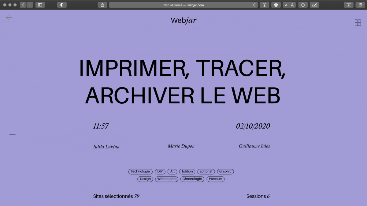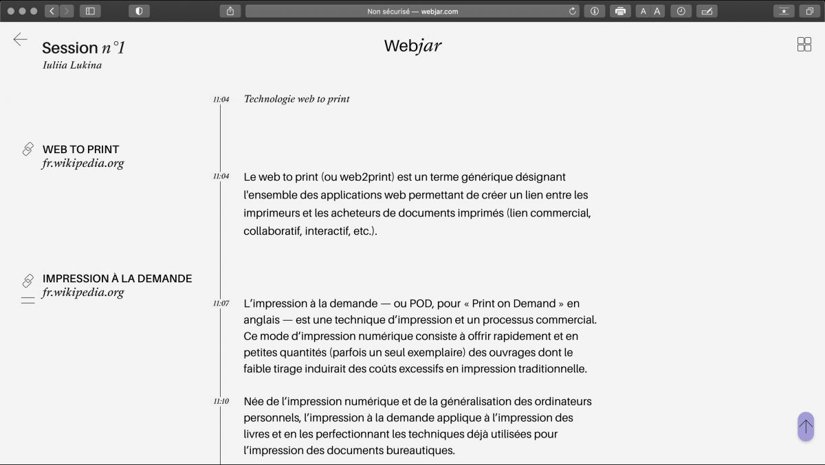 Ce projet a pour titre Webjar. Ici, le « Web » représente un espace multifonctionnel et multi- sources et « Jar » (le bocal en français ) représente une forme métaphorique de mon outil dans le sens où les bocaux sont utilisés pour conserver quelque chose et pour partager son contenu avec les autres. C’est donc ceci qui fait l’idéologie de mon projet.