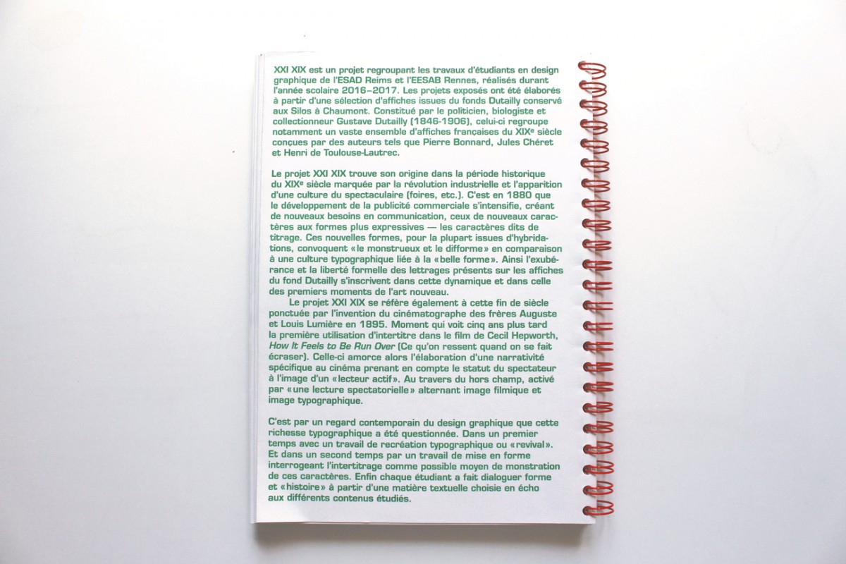 XXI XIX est un projet regroupant les travaux d’étudiants en design graphique de l’ESAD Reims et l’ÉESAB Rennes, réalisés durant l’année scolaire 2016-2017 et coordonnés par Sonia da Rocha, Brice Domingues et Benjamin Gomez (enseignant à l’ÉESAB Rennes). Les projets exposés à l’espace Tisza Textile Packaging, dans le cadre de la Biennale de design graphique de Chaumont 2017 ont été élaborés à partir d’une sélection d’affiches issues du fonds Dutailly conservé aux Silos à Chaumont. Constitué par le politicien, biologiste et collectionneur Gustave Dutailly (1846—1906), celui-ci regroupe notamment un vaste ensemble d’affiches françaises du XIXe siècle conçues par des auteurs tels que Pierre Bonnard, Jules Chéret et Henry de Toulouse-Lautrec.